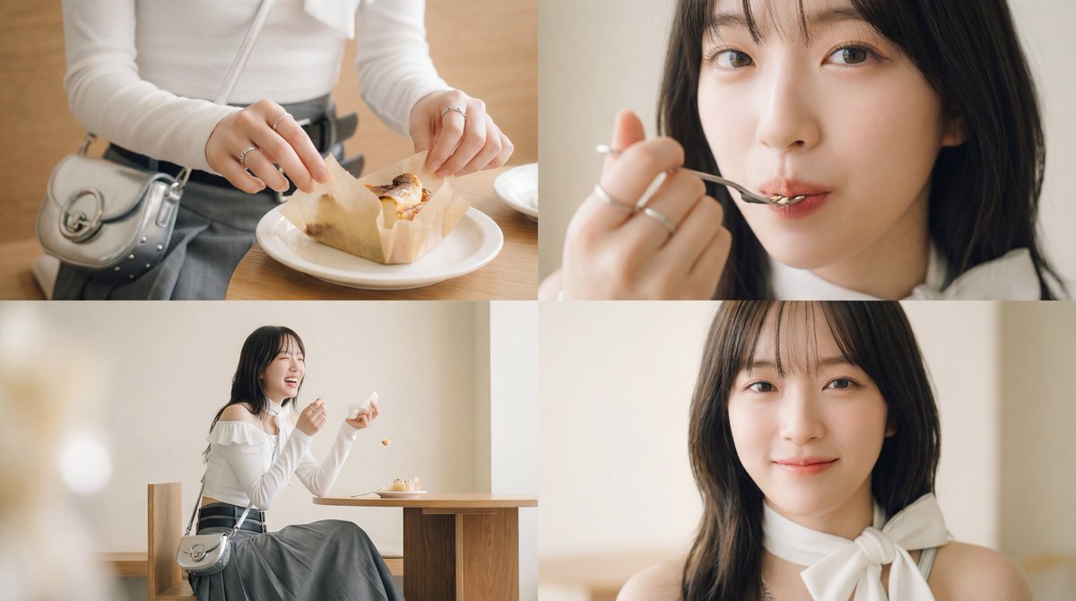 A detailed cinematic prompt used to generate four images with Nano Banana Pro, which were then used as input for a Kling 3.0 Omni video. The prompt focuses on capturing the charm of a woman eating sweets, emphasizing cinematic techniques and ASMR sound design.