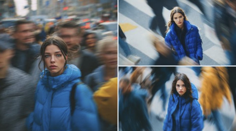 Three detailed prompts for generating ultra-realistic cinematic street portraits of a young woman in a blue puffer jacket, focusing on motion blur, depth of field, and dramatic urban atmosphere.