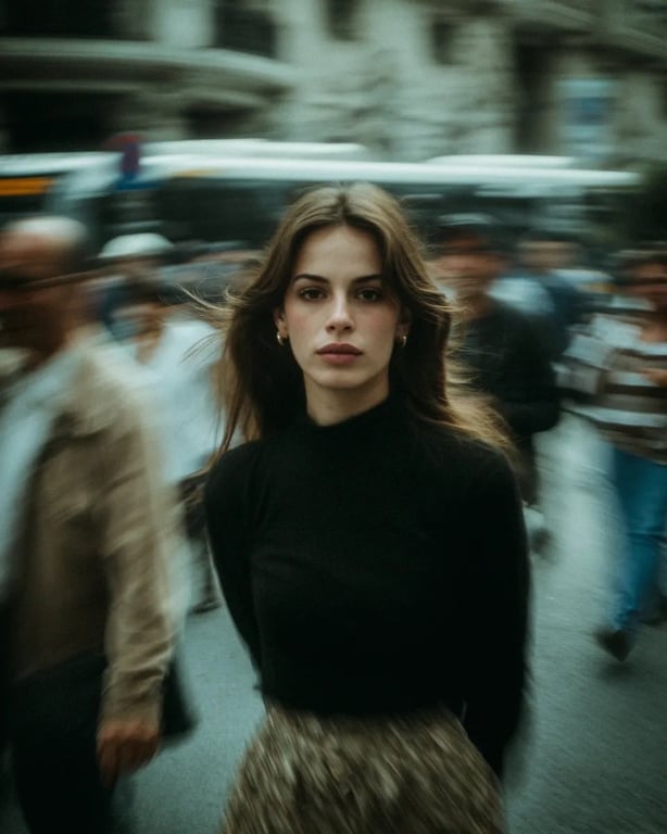 Two related prompts for generating cinematic street portraits of a young woman, utilizing motion blur for dynamic effect, sharp focus on the subject, and specific photographic elements like lens type, lighting (natural or golden hour), and urban setting.