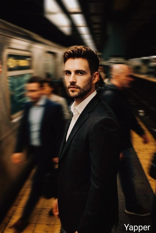 A photorealistic prompt for Nano Banana 2 to generate a cinematic portrait of a serious man in a suit on a busy subway platform. The prompt emphasizes sharp focus on the subject, strong motion blur on commuters, dramatic urban atmosphere, and warm lighting to achieve a modern thriller movie aesthetic.