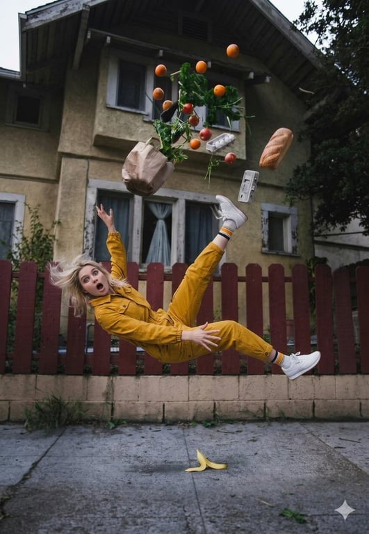 A highly detailed, structured prompt for Nano Banana Pro generating a cinematic, surreal image of a young woman falling backward on a suburban street, with a grocery bag exploding mid-air and items floating, implying the cause was a banana peel.