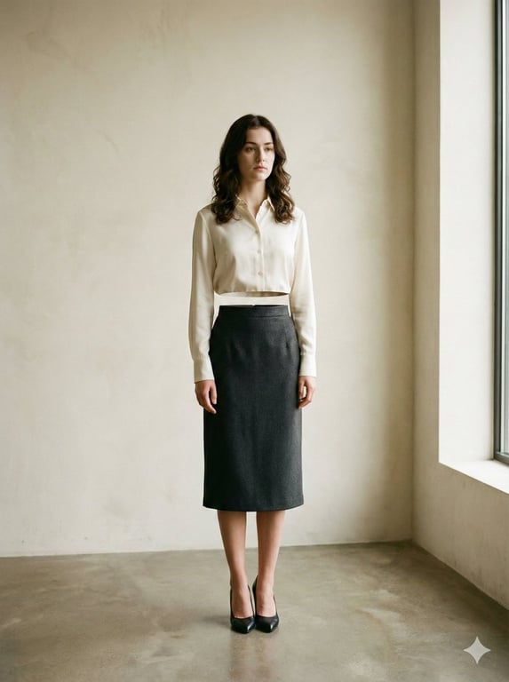 A structured prompt for generating a cinematic surreal realism image of an elegantly dressed young woman whose body is horizontally bisected at the waist, with the upper torso floating six inches above the hips, set in a minimalist interior with analog film aesthetics and soft side-lighting.