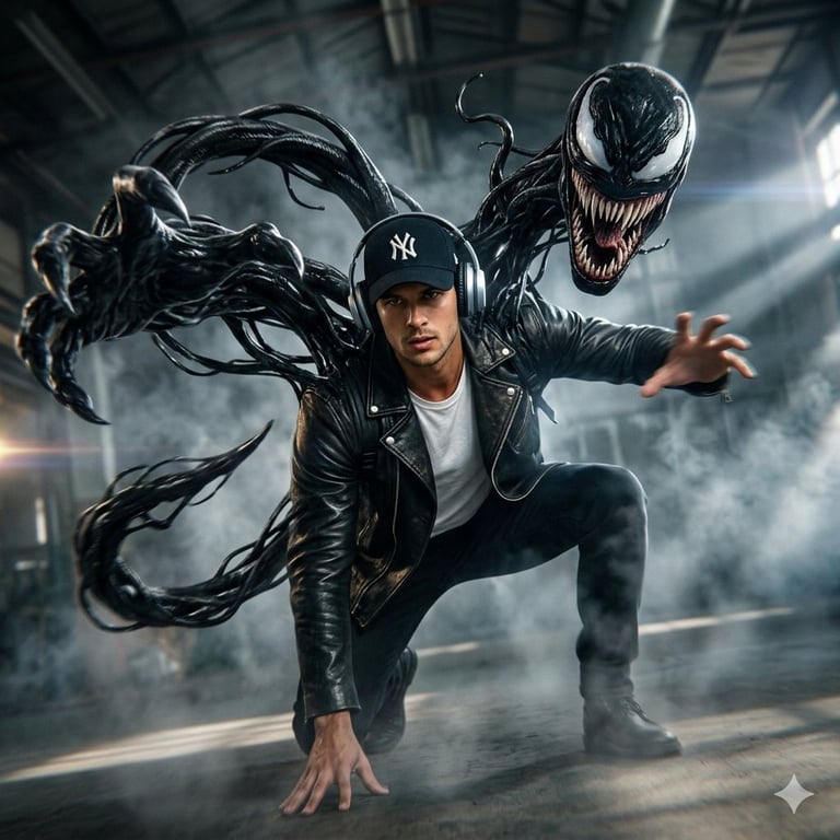 A prompt for generating an ultra-realistic cinematic movie scene featuring a young man (with identity locked to a reference photo) in a dynamic action pose, with a Venom-like symbiote bursting from his back. The prompt specifies the setting (dark industrial warehouse), lighting (sharp light beams, warm highlights), and camera angle (low and tilted) for a Hollywood action-poster vibe.