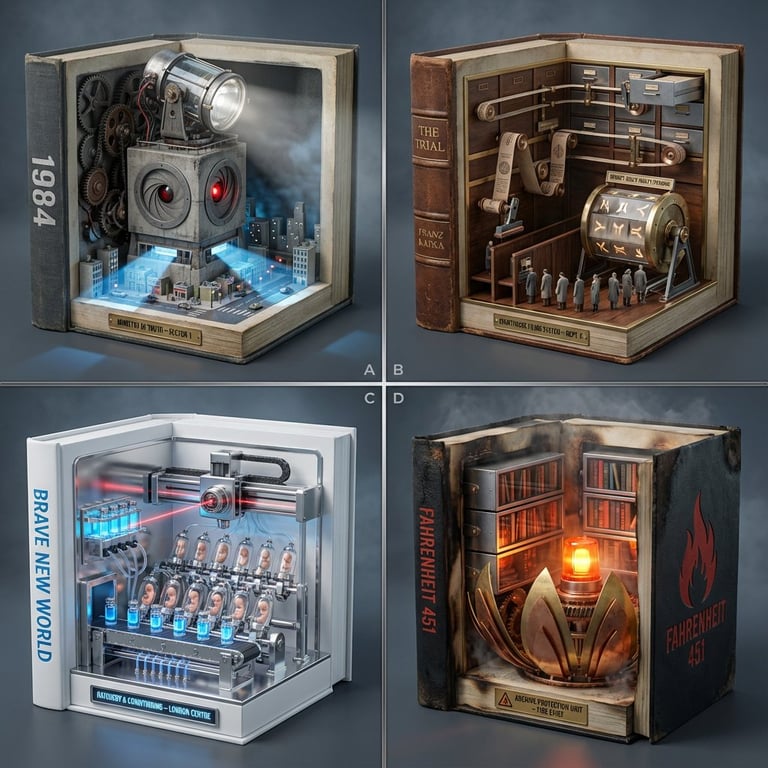 A complex, multi-panel prompt designed to create a 2x2 grid of photorealistic miniature dioramas. Each panel depicts a classic dystopian novel (1984, The Trial, Brave New World, Fahrenheit 451) transformed into a miniature, mechanized surveillance or administration machine embedded inside a hollowed-out hardcover book. The prompt emphasizes cold industrial lighting, micro-detail, and specific mechanical elements related to each book's theme.