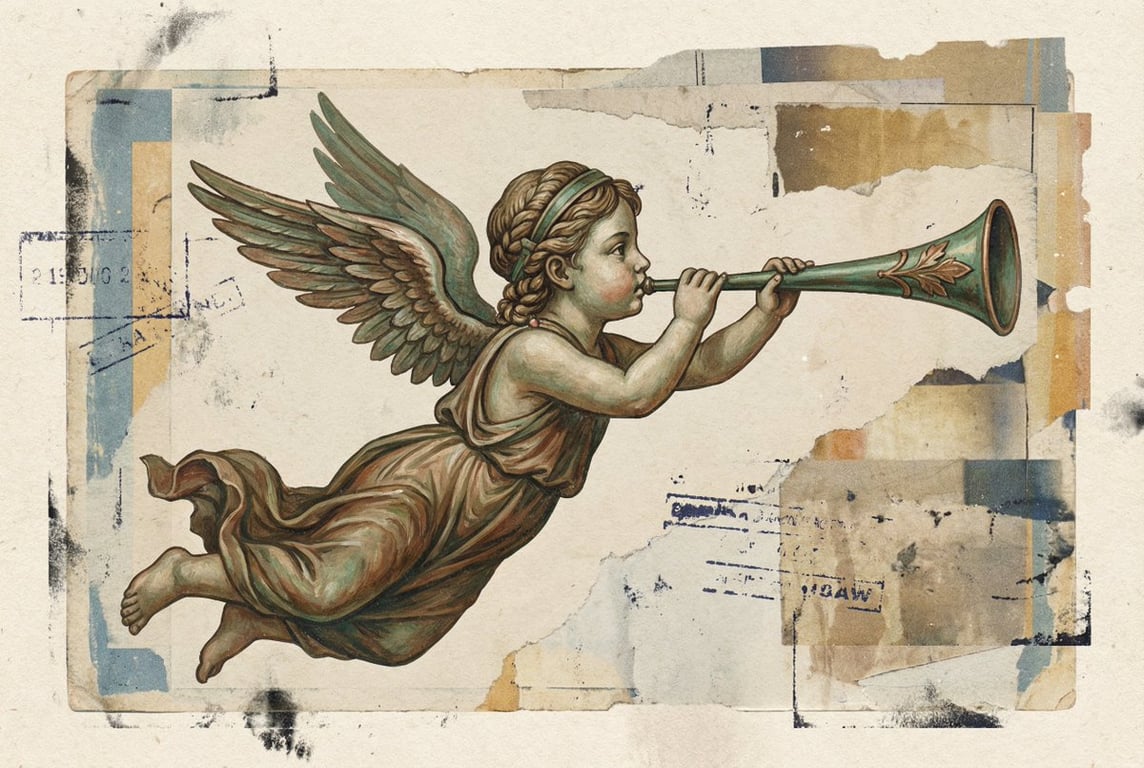 A prompt for generating a painting with an antique or classical aesthetic, depicting a winged figure (cherub or angel) in profile blowing a conical horn. The figure is rendered in specific colors (green, brown, copper) and details the pose and decorative elements, suggesting a style similar to a weather vane.