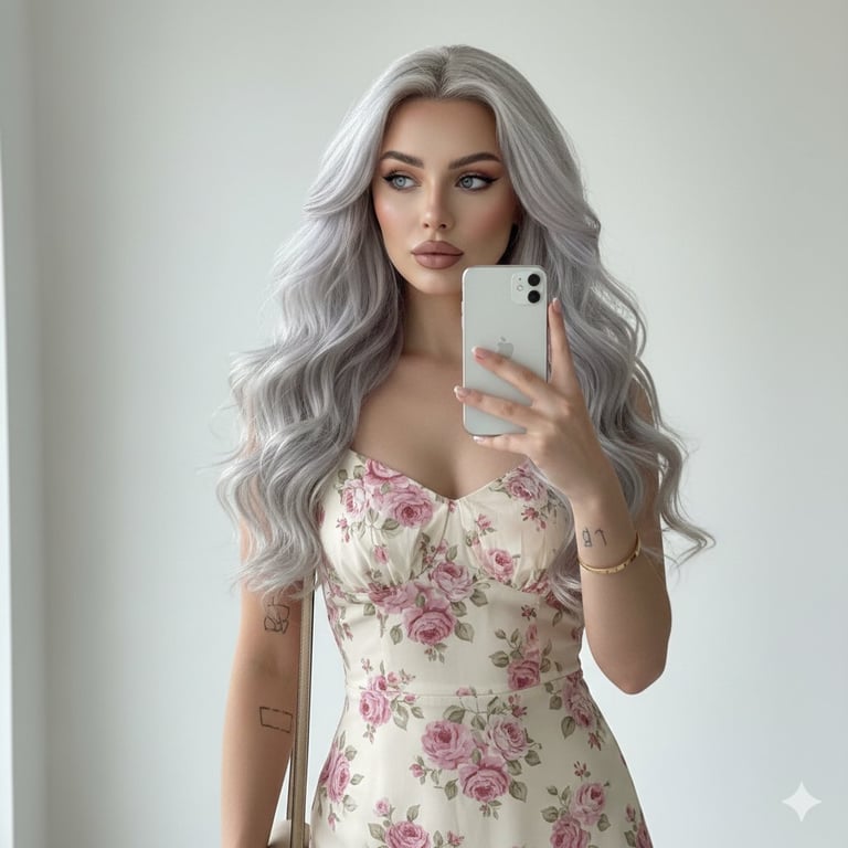 An image generation prompt for Google Gemini Nano Banana Pro 3.0, aiming for a 'clean girl aesthetic' mirror selfie. The prompt details the subject's appearance (silver-grey hair, matte mauve lips, minimalist tattoos), fashion (cream floral midi dress, gold Cartier-style bracelet), and setting (bright, minimalist interior with soft natural daylight), focusing on a high-resolution, sharp, and ethereal look.