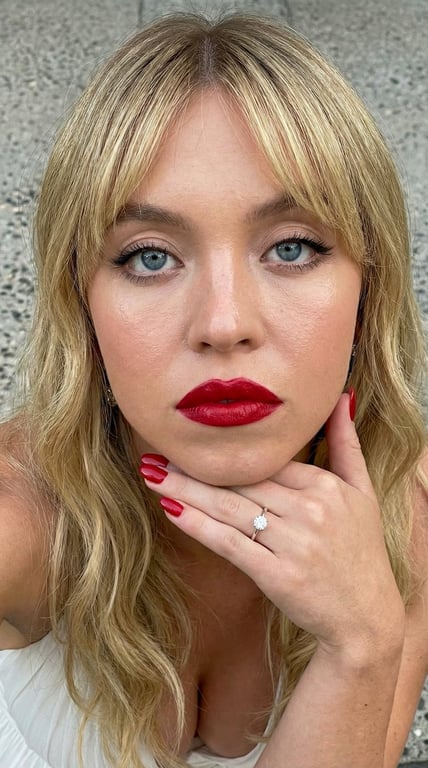 A descriptive prompt for generating a super close-up, vertical portrait (9:16) of a stunning young woman with a supermodel face. It emphasizes porcelain skin, blonde spaghetti waves, piercing blue eyes with sharp eyeliner, and a soft pout. The composition features her hand gently cupping her chin, tilting her face upward, against a muted, out-of-focus concrete background.