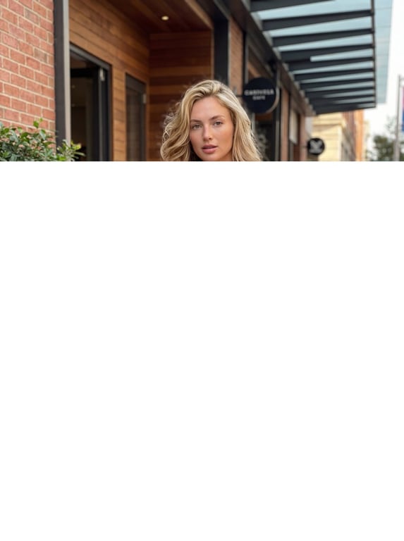 A structured JSON prompt for generating a high-end commercial lifestyle photograph. The core instruction is to strictly preserve the exact details (color, pattern, texture, fit) of a garment from a reference image, placing the subject (a white American female model) in a natural, relaxed pose on an outdoor urban sidewalk setting with soft natural daylight.