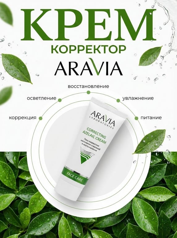 An extremely detailed JSON prompt for generating a commercial product advertisement image (CGI composite style) for a cosmetic cream tube. It specifies a clean, clinical mood, a white circular platform, a bed of dark green leaves, and realistic water droplets/condensation effects. The prompt includes specific Russian text labels and detailed lighting instructions for a high-key, saturated look.