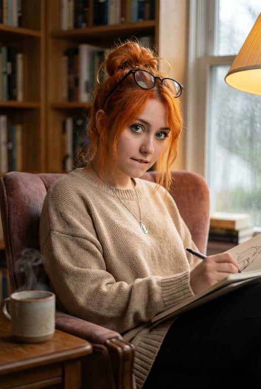 A complex JSON prompt designed for consistent character generation (Project Alev), requiring strict preservation of facial features (eye shape, freckle pattern) from a master reference. The scene is a cozy, intellectual portrait in a modern library, featuring soft window light and warm reading lamp glow, focusing on the character's vibrant copper hair and focused expression.