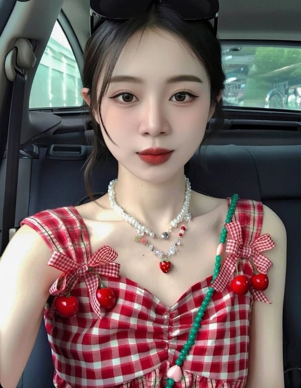 A detailed prompt for generating a realistic image of a young East Asian woman taking a selfie in a car, featuring a specific 'coquette' aesthetic with a gingham dress, cherry decorations, layered necklaces, and playful expression, emphasizing high detail and realistic photography.