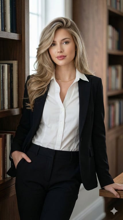 A detailed prompt for a photorealistic portrait of a young professional woman in a tailored black blazer and white shirt, set in an upscale library or executive office. The prompt specifies soft, diffused lighting and a shallow depth of field to emphasize the subject's confident pose and chic aesthetic.