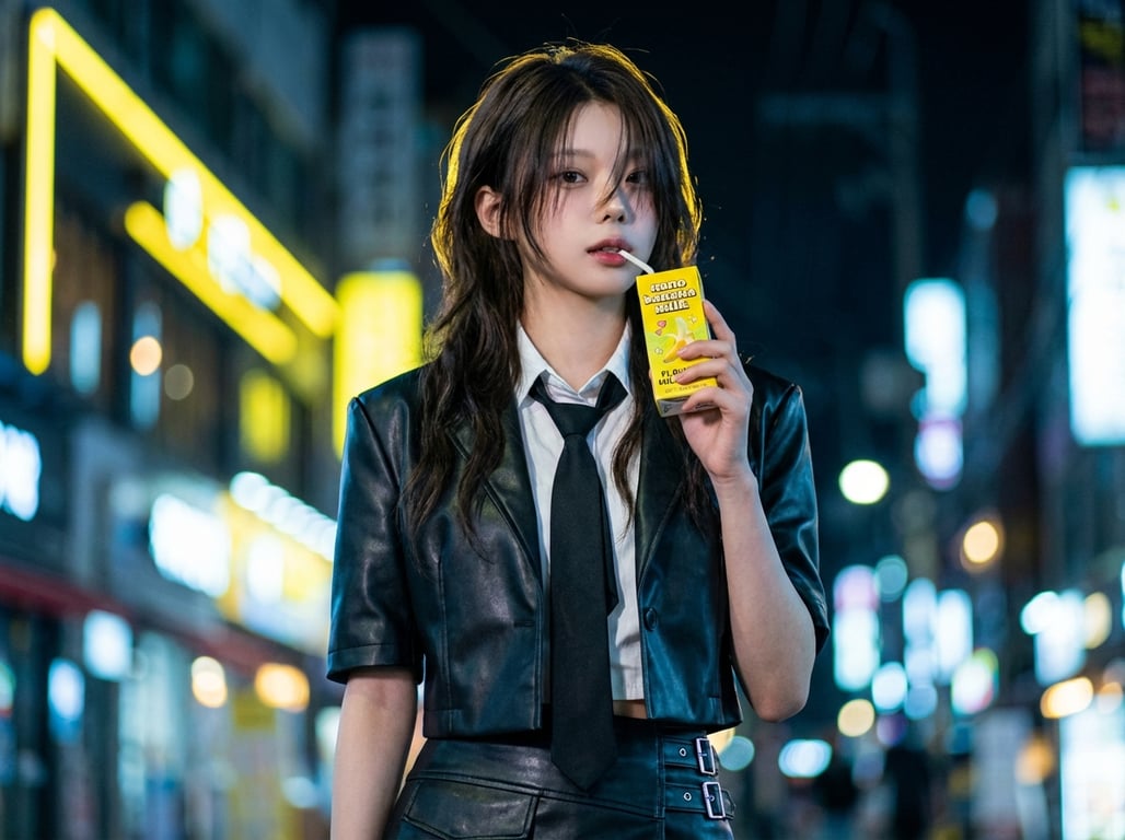 A detailed prompt for a medium shot portrait of the 'Nano Banana Pro' mascot, described as a cool Gen Z East Asian woman with a trendy wolf-cut mullet, wearing a futuristic 'corporate cyberpunk' outfit (faux leather blazer, mini skirt) and holding a carton of 'nano banana milk' in a neon-lit, candid influencer snapshot style.