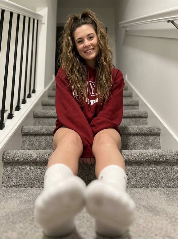 A structured prompt for generating a candid, cozy portrait of a young woman sitting on a carpeted staircase, wearing an oversized hoodie, emphasizing warm, moody lighting and a shallow depth of field that uses foreshortening to blur the feet in the foreground.