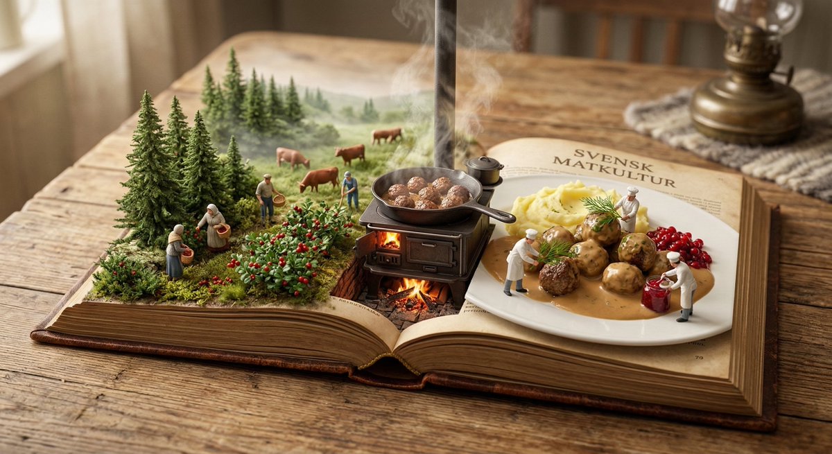A highly structured, code-like prompt for Gemini Nano Banana 3 to generate a miniature diorama (1:87 scale) of traditional Swedish meatballs (Köttbullar) presented as a culinary pop-up book. The prompt details the scene across three sections: origin (forest/nature), transformation (cooking stove), and the final feast (plating), emphasizing tilt-shift photography and a cozy Scandinavian aesthetic.