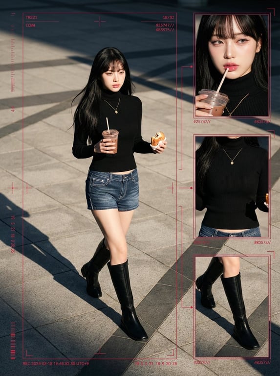 An extremely detailed, multi-part prompt for Nano Banana Pro to generate a cyber-grunge surveillance-style fashion editorial collage. It specifies the subject (a young Japanese woman with K-pop inspired makeup and Y2K street fashion), the scene (late-afternoon plaza with dramatic shadows), technical style (Hyper-real 8K, cinematic contrast), and complex UI overlay elements (bounding boxes, telemetry, timecode).