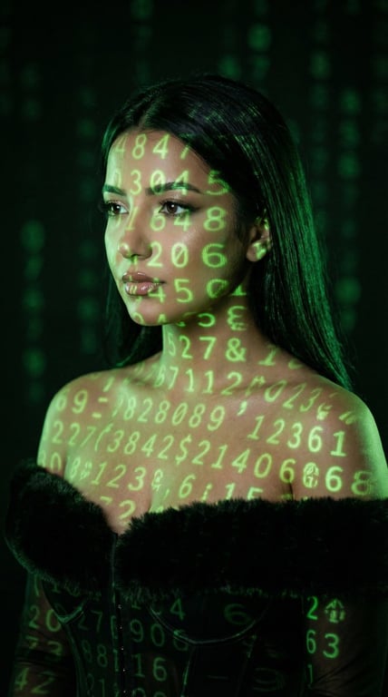 A highly detailed JSON-formatted Nano Banana Pro prompt for generating an ultra-high resolution, cinematic beauty portrait of a woman with green numeric projections mapped across her face and body, emphasizing photorealism, low-key lighting, and correct projection physics.