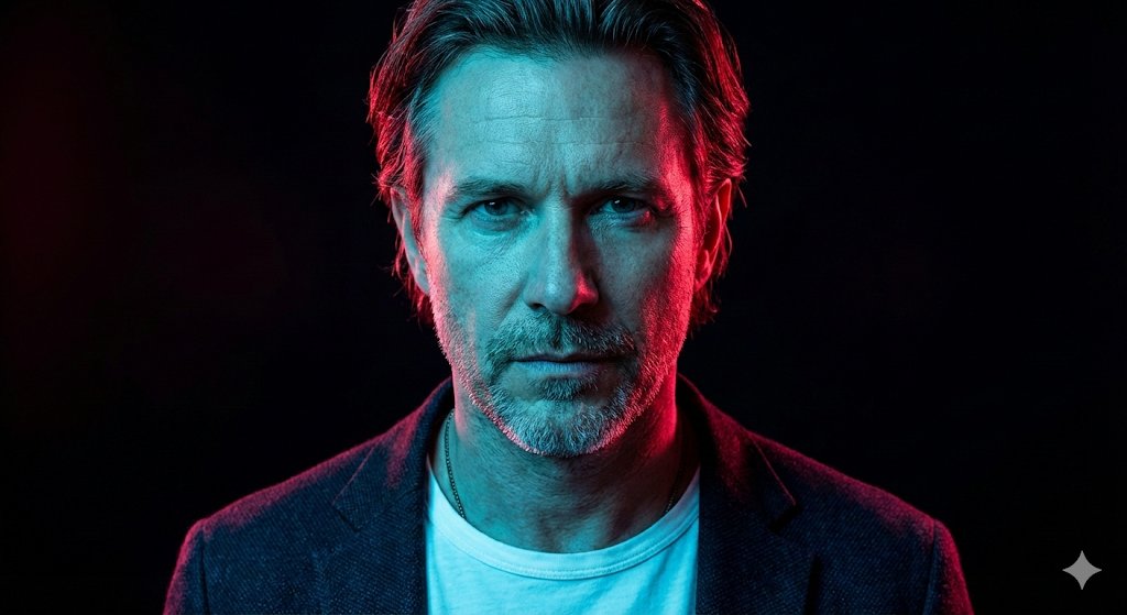 A highly detailed, JSON-formatted Nano Banana Pro prompt for generating a dramatic, high-contrast cinematic studio portrait. It specifies a middle-aged male subject with a confident gaze, using intense blue/cyan key lighting and red/magenta rim lighting against a pure black background, achieving a stylized cyberpunk/neo-noir aesthetic.