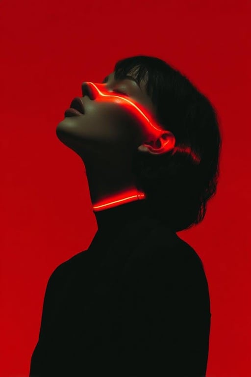 A prompt for generating an ultra-stylized cinematic portrait with a futuristic cyberpunk vibe. It features a person in side profile against a deep red monochrome background, highlighted by glowing neon red light strips tracing across the face and neck, emphasizing high contrast and dramatic shadows.