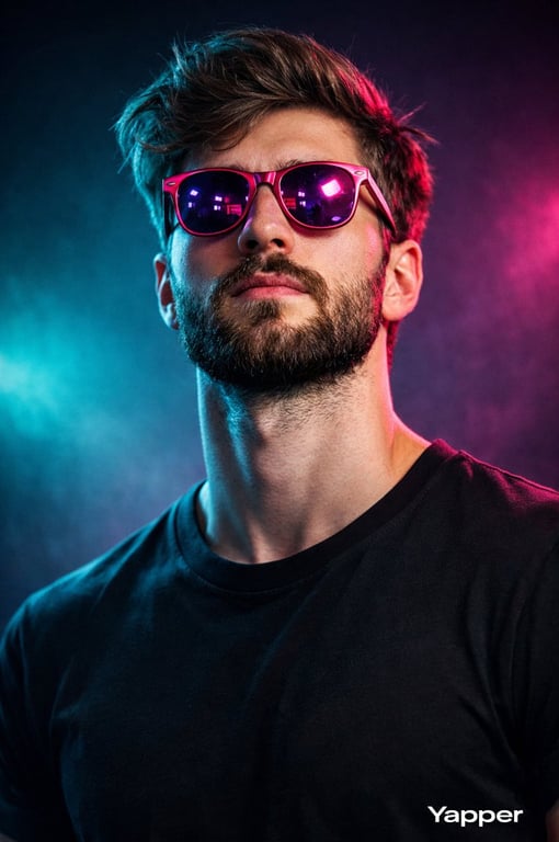 A prompt for Nano Banana 2 to create a bold, cinematic, 8K portrait of a confident young man with a beard, featuring vibrant pink sunglasses reflecting neon lights and dramatic teal and magenta lighting in a cyberpunk studio setting.