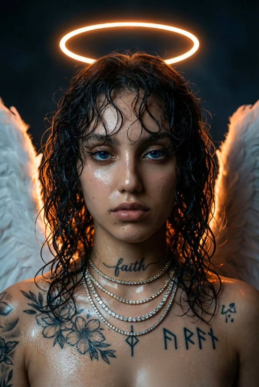 A highly detailed prompt for generating a cinematic dark fantasy portrait. It features a woman with wet-look dark curls, shimmering dewy skin, and intense blue eyes. The fantasy elements include a vibrant glowing orange neon halo above the head and large white feathery wings in the background, contrasted by dramatic orange backlighting and luxury gold and diamond-encrusted necklaces. The prompt requires reference images for specific details like tattoos and hair texture.