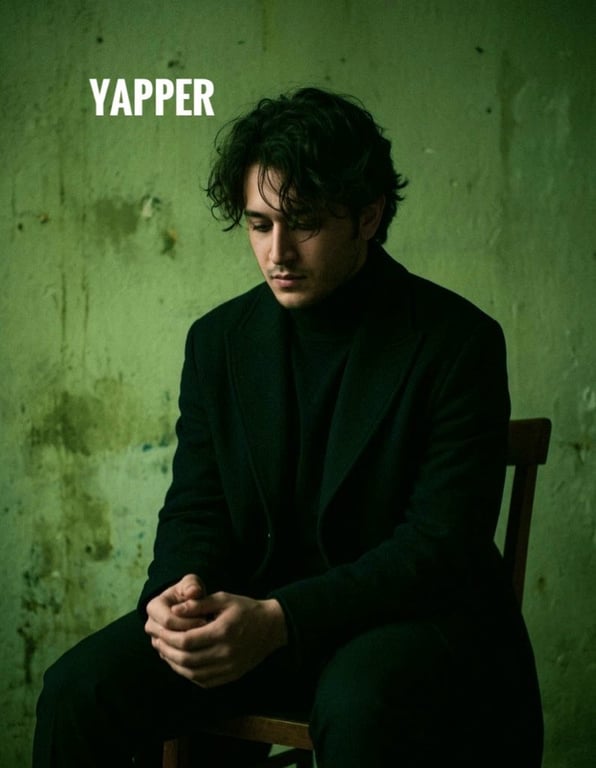 A prompt for Nano Banana Pro to create a dark, moody, photorealistic portrait of a young man in a black turtleneck and overcoat. The scene emphasizes low-key lighting from a soft side source, creating deep shadows and a raw, cinematic atmosphere with heavy film grain and muted color grading.