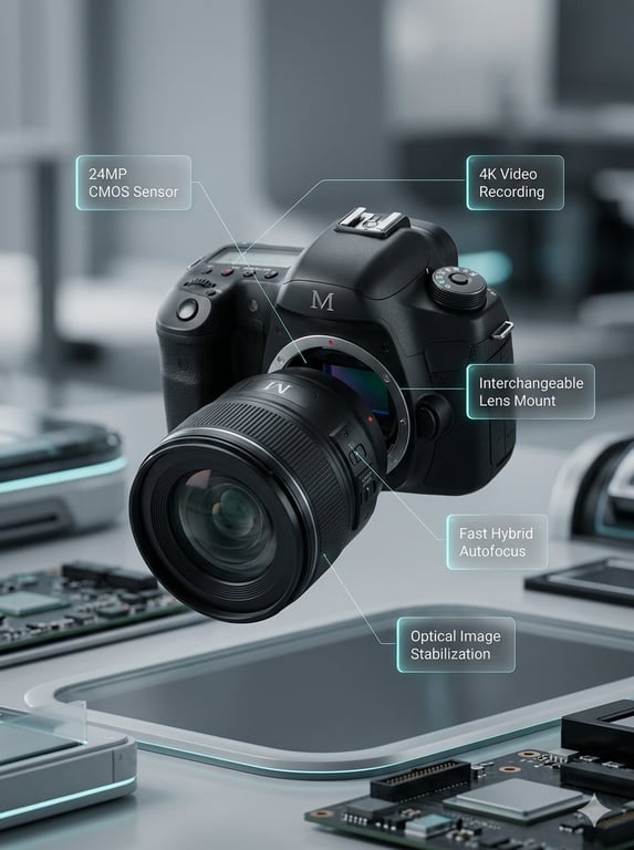 Two distinct image prompts for Nano Banana 2. The first generates a deconstructed view of a camera, and the second generates a high-end product visualization of an assembled camera floating in the air with technical UI annotations. The third prompt is a motion prompt for Kling AI, which is excluded.