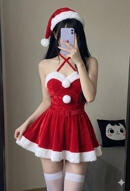 A prompt utilizing depth map control to generate a photo of a woman taking a mirror selfie while wearing a red velvet Santa mini dress and thigh-high stockings, specifying the use of an attached depth map for scene structure.