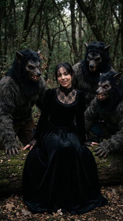 A highly structured JSON prompt for generating a cinematic fantasy image of a vampire girl sitting on a log in a dark forest, flanked by three highly detailed werewolf creatures, focusing on gothic Victorian style and moody lighting.