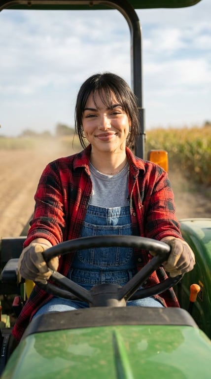 A highly structured JSON prompt detailing the scene, character appearance (face, hair, accessories), pose, outfit, environment, lighting, and photography style for generating a photorealistic image of a young woman driving a green tractor during golden hour.