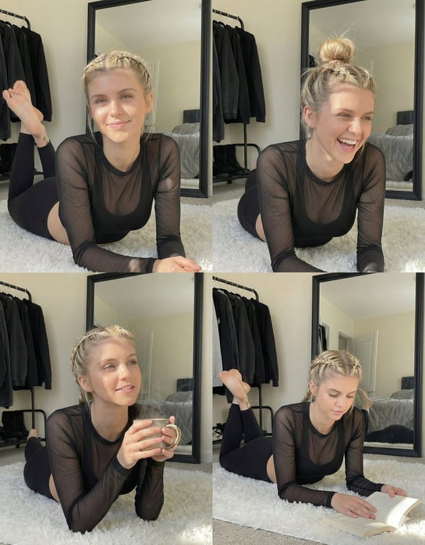 A highly specific prompt for generating a portrait of a young woman lying on a shaggy rug, detailing her pose, clothing, and the environment (clothing rack, mirror, bed). The key feature is the use of bright, direct sunlight to create defined shadows, emphasizing texture and realism.