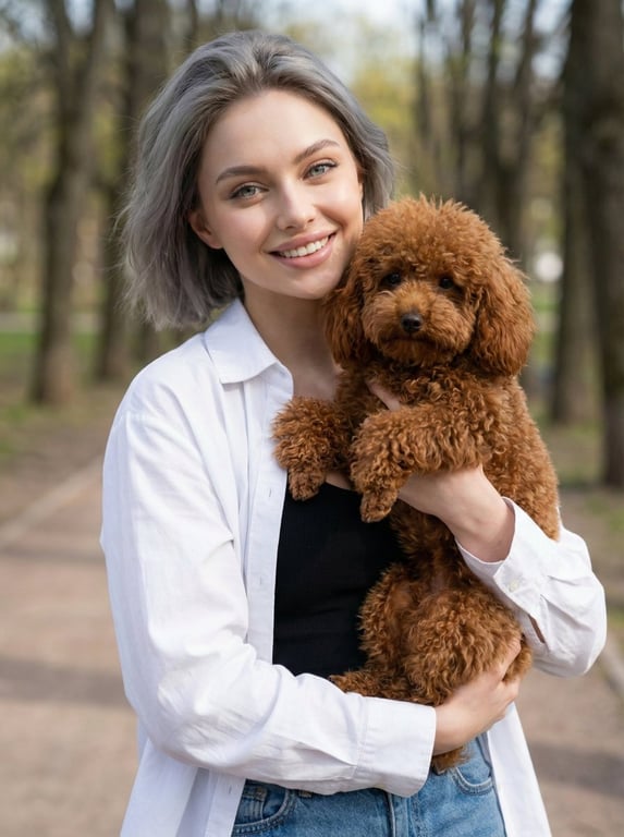 A highly structured JSON prompt designed for image generation models, specifying detailed parameters for a lifestyle portrait photograph. It includes composition, subject details (a young woman holding a dog), environment, lighting, color palette, technical camera settings, and artistic style, aiming for a warm, candid urban aesthetic with shallow depth of field.