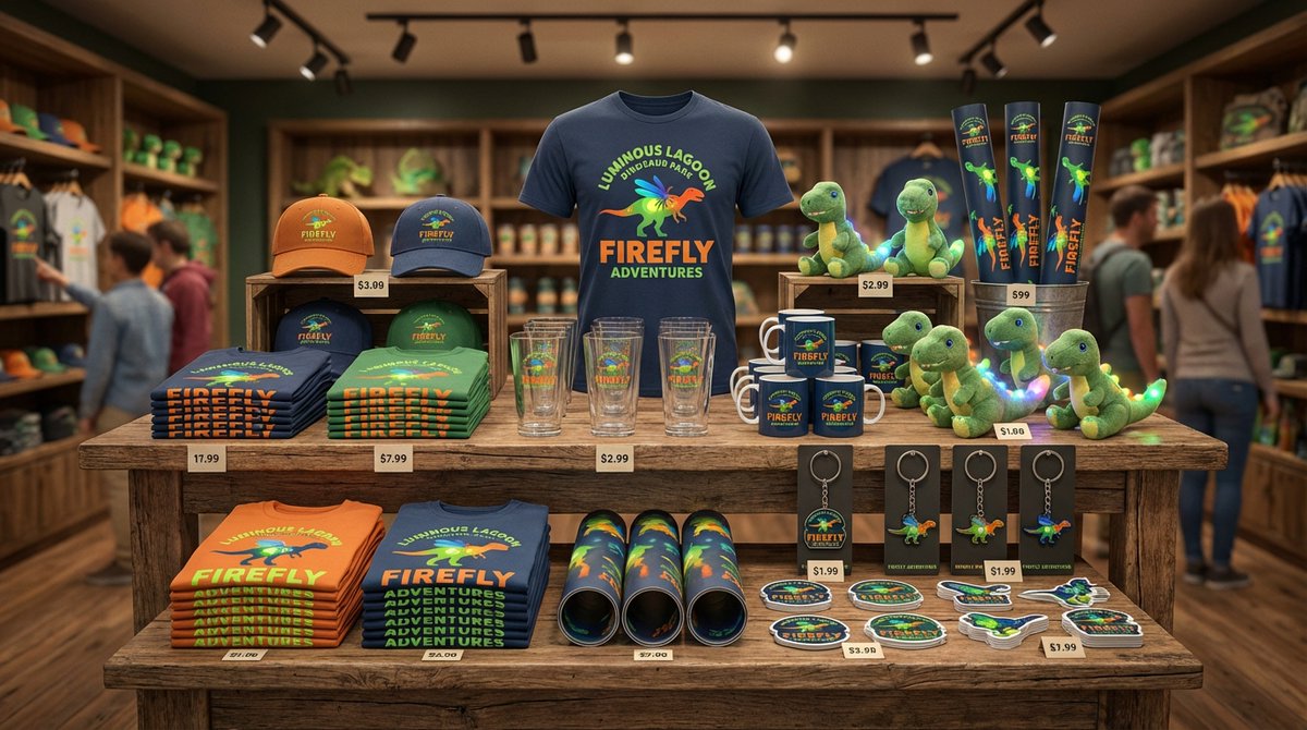 A prompt template used with Nano Banana in Adobe Firefly to generate a hyper-realistic product photograph of a fully branded dinosaur park gift shop merchandise table. The prompt uses placeholders for the park name and emphasizes detailed textures, lighting, and arrangement.