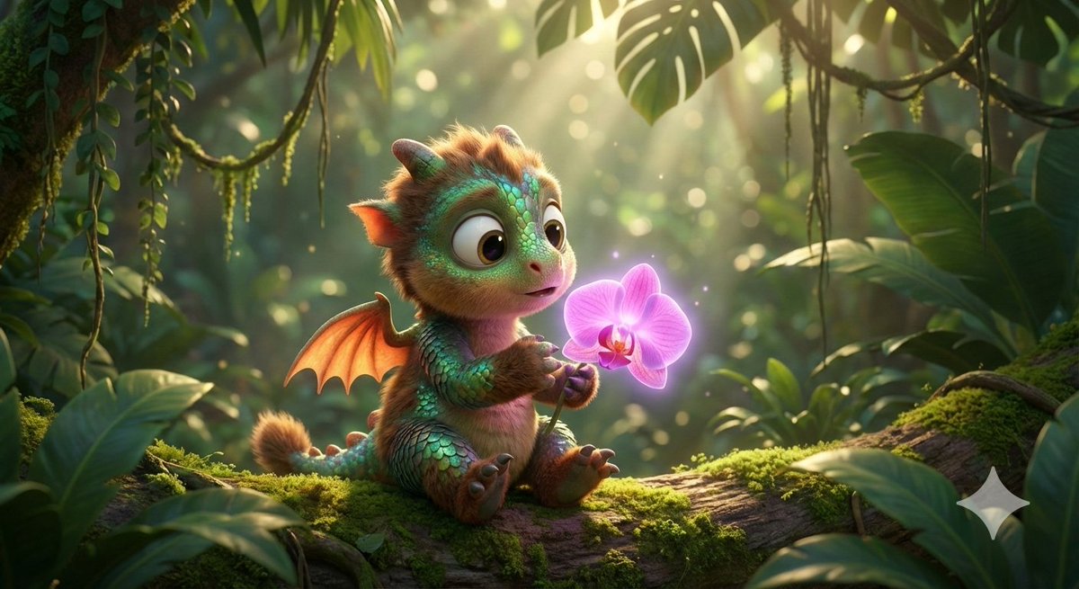 A structured prompt for generating a high-fidelity 3D animation image in the Disney-Pixar style. It describes a cute hybrid creature (sloth fur and dragon scales) sitting on a mossy log and holding a glowing, magical pink orchid in a sun-drenched tropical jungle.
