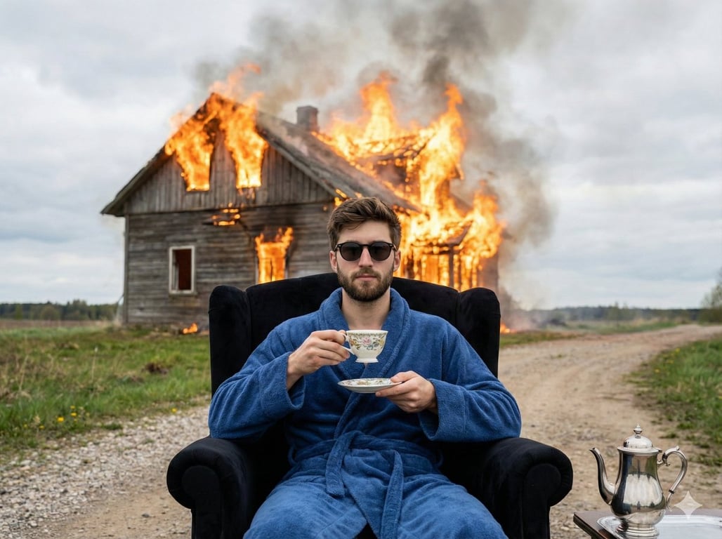 An image generation prompt for Nano Banana Pro describing a surreal, documentary-style photograph. A man in a blue terry cloth robe and sunglasses sits calmly in a velvet armchair on a dirt road, holding a teacup, while a wooden farmhouse behind him is engulfed in flames.