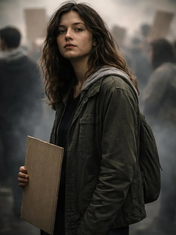 A highly detailed JSON prompt for generating an ultra-realistic, documentary-style cinematic portrait of a young woman at a protest. It emphasizes emotional resilience, authentic appearance (worn olive-green jacket), and technical specifications like a 50mm lens and shallow depth of field, using a blank cardboard protest sign as a prop.