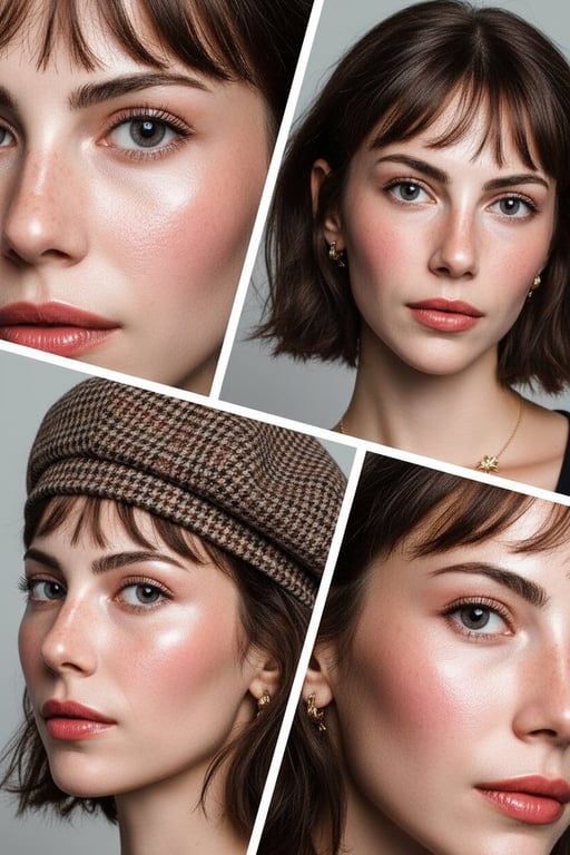 A detailed, structured prompt for generating an ultra-high-quality, hyper-realistic beauty editorial collage in a tilted diagonal grid layout. The prompt specifies a 'doll-like' aesthetic with porcelain glass skin, intense rosy blush (Igari style), doll-like eyes with softlens, and glossy lips, requiring consistent facial identity across all four panels.