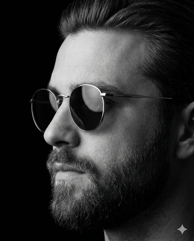 A prompt for generating a photorealistic monochrome studio portrait of a stylish man in side profile. It emphasizes high-contrast chiaroscuro lighting, round metal-frame sunglasses, and sharp focus on fine skin texture, aiming for a timeless, elegant cinematic fashion editorial style using an 85mm lens aesthetic.