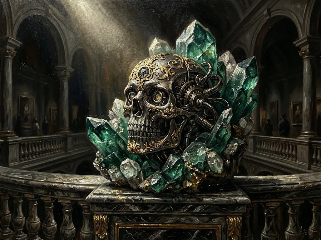 A detailed prompt for Nano Banana Pro describing a dramatic chiaroscuro oil painting texture of a biomechanical skull embedded in crystal on a marble balcony, using deep emerald and burnt umber tones with visible brushwork and ornate gold accents.