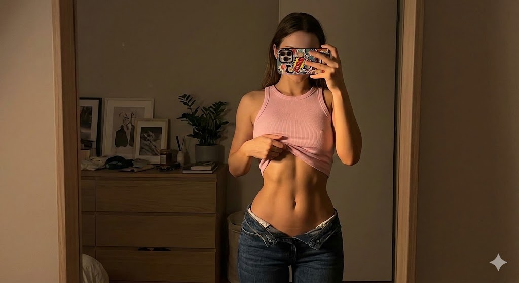 A structured JSON prompt for Nano Banana Pro to generate a hyper-realistic, high-contrast mirror selfie of a young woman with an extreme hourglass figure, emphasizing muscle definition through dramatic, moody lighting.