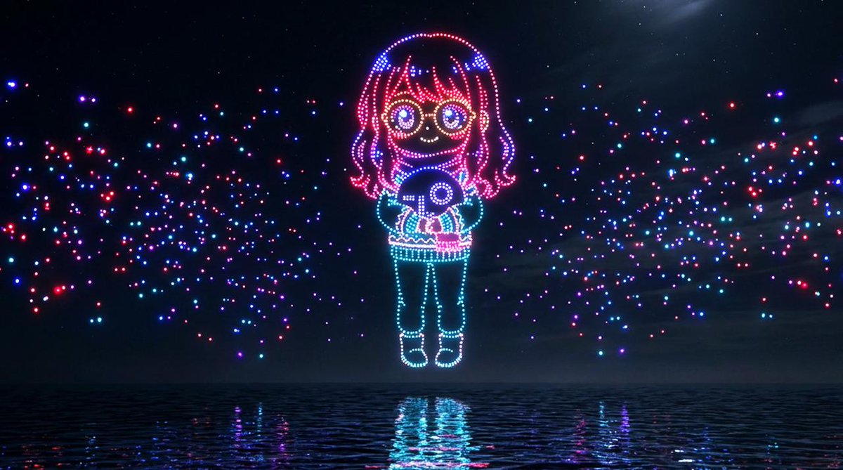 A prompt for generating a realistic photo of a character's shape being formed in the night sky over the sea by thousands of glowing drones, creating a spectacular, fantastical illumination event captured with a wide-angle lens. It uses a reference image to define the character's features.