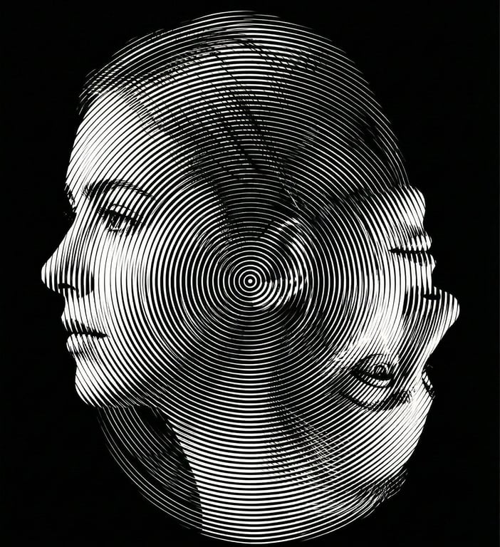 A highly technical prompt for generating a dual-orientation optical illusion portrait in strict monochrome, where the image reveals a young woman's side profile when viewed upright, and an elderly woman's side profile when rotated 180 degrees, requiring precise contour reinterpretation and Moiré interference surface application.