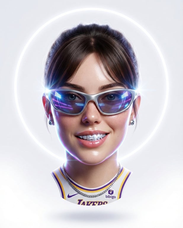 A highly specific prompt for generating a hyper-stylized, dynamic 3D floating head portrait based on a reference image, featuring a confident expression, diamond-studded braces, silver sports sunglasses, and an official Lakers shirt logo, set against a white-on-white background with neon accents and strong rim lighting.