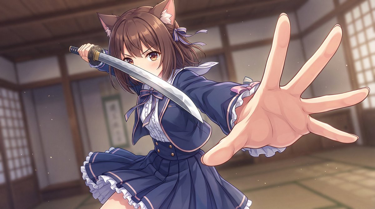A highly detailed, structured prompt for generating a dynamic, anime-style illustration of a character in a specific action pose, emphasizing extreme perspective distortion (super wide-angle lens) and dramatic camera angles (Dutch angle). The prompt meticulously defines the scene, character appearance, outfit, pose, and the exaggerated perspective of the hands, aiming for a high-impact visual effect.