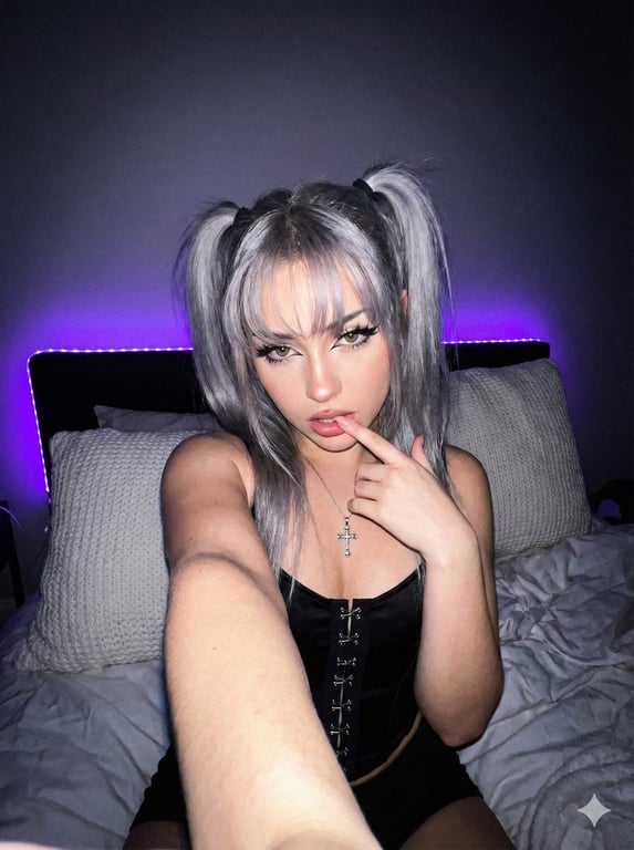A structured JSON prompt for Gemini Nano Banana Pro to generate a high-angle selfie in the 'E-girl' and 'Y2K grunge' aesthetic. It features a woman with silver-grey hair in pigtails, heavy makeup, wearing a corset-style top, set in a dimly lit bedroom accented by vibrant neon purple LED strip lighting, utilizing harsh on-camera flash.