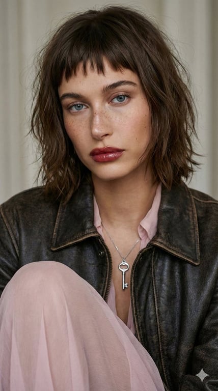 A detailed prompt for generating an editorial fashion portrait of a young woman with a messy shaggy wolf-cut hairstyle. It emphasizes a raw, melancholic aesthetic, natural freckles, light blue eyes, and specific wardrobe details like a distressed leather jacket over pink fabric, using technical specifications like an 85mm lens and 9:16 aspect ratio for a hyper-detailed, photorealistic result.