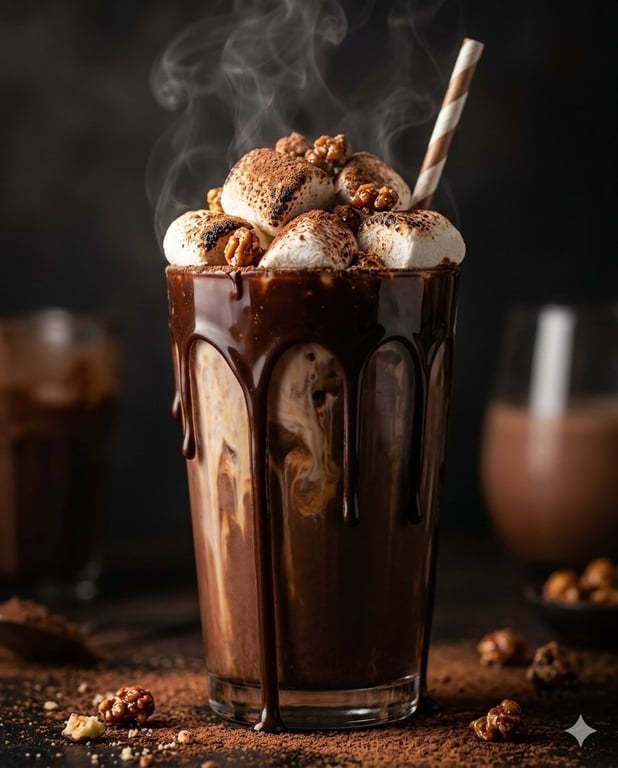 A highly technical prompt for Google Gemini Nano Banana Pro 3.0, detailing a close-up food photograph of a decadent chocolate brownie stack with vanilla ice cream and pouring hot chocolate sauce. The prompt specifies camera settings (Sony A1 85mm f/1.4), lighting, texture, and composition for an ultra-realistic, editorial look.