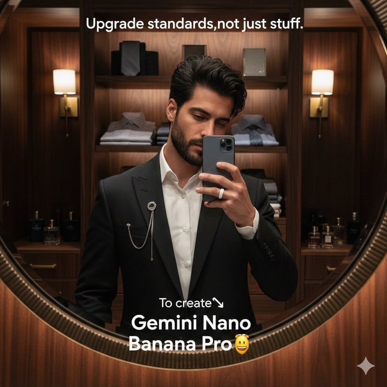 A highly detailed prompt for generating a photorealistic, editorial luxury lifestyle image of a handsome young man taking a party selfie in a lavish walk-in closet. It specifies his appearance (messy black hair, short beard), sophisticated attire (tailored black blazer, white dress shirt), the setting (dark walnut wood, gold sconces), and technical camera settings (85mm lens, f/1.8 aperture) to achieve a confident, sophisticated mood.