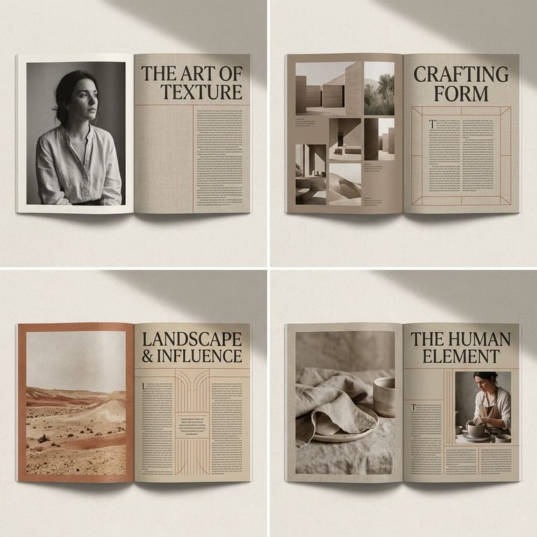 An editorial design prompt idea for Nano Banana Pro, focusing on creating a magazine spread concept using muted earth tones, raw linen texture, large serif headlines, geometric rule lines in terracotta, and cinematic side lighting for a high-end print finish.