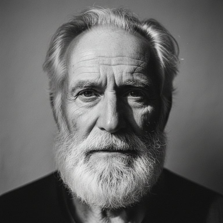 A straightforward portrait prompt for a highly realistic black-and-white photo of an elderly bearded man with strong side lighting and detailed wrinkles.